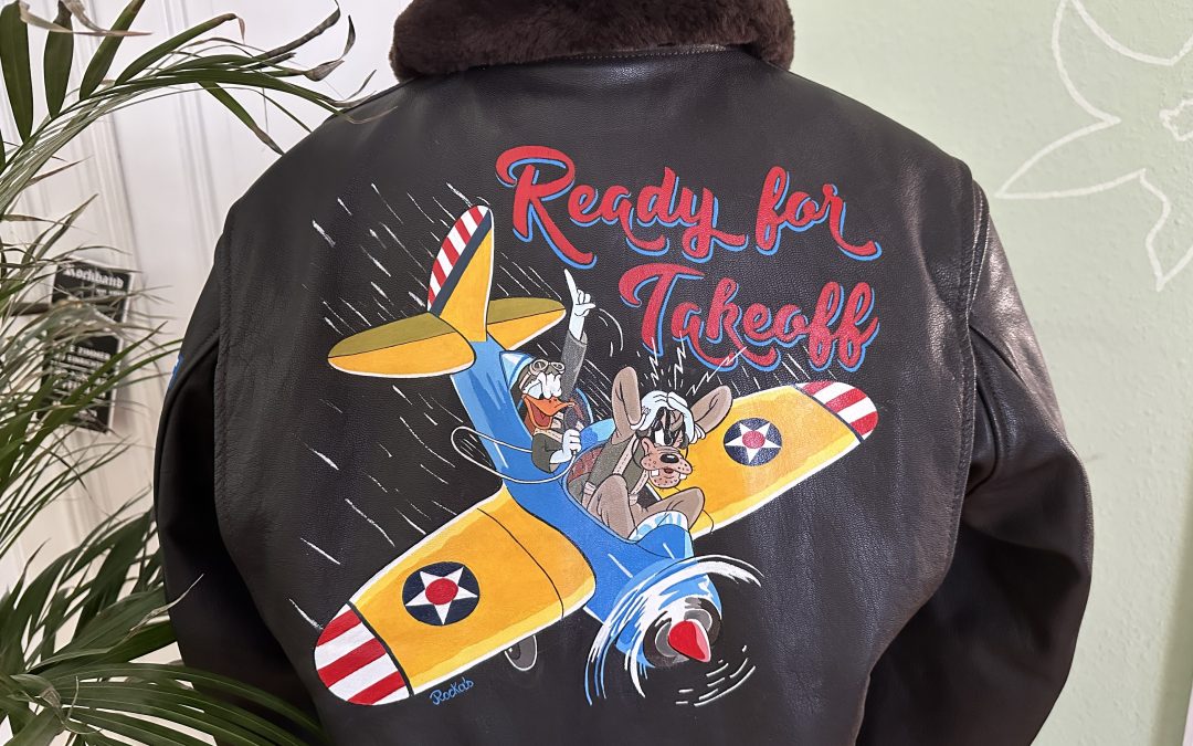 Diese G-1 Fliegerjacke erzählt eine humorvolle Geschichte: Donald und Goofy sitzen gemeinsam im Cockpit – Goofy ist sichtlich genervt on Donalds chaotischen Flugmanövern und en endlosen Anweisungen.